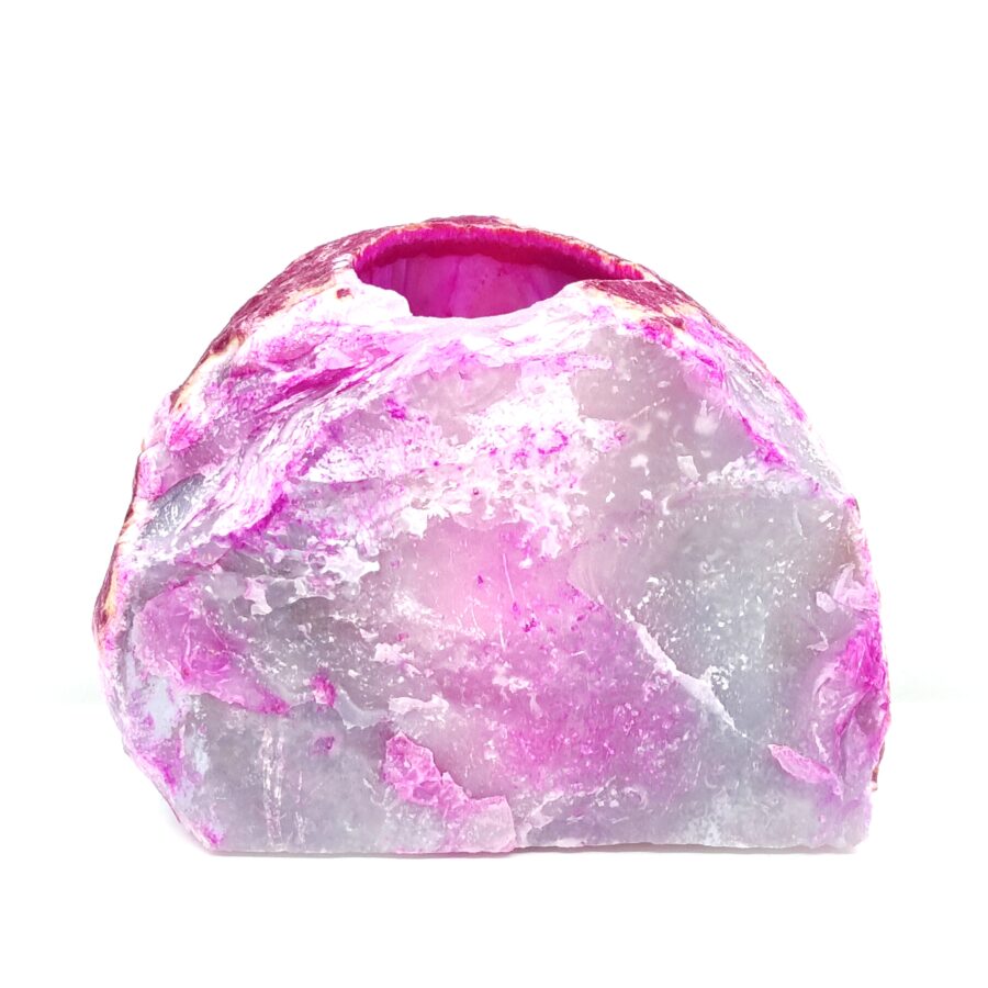 Achátový svietnik ružovej farby s krásnou kresbou a s otvorom na čajovú sviečku. Zaslaný vám bude konkrétny kus zobrazený na fotografii. Ide o neopracovaný kameň vyleštený z prednej strany.