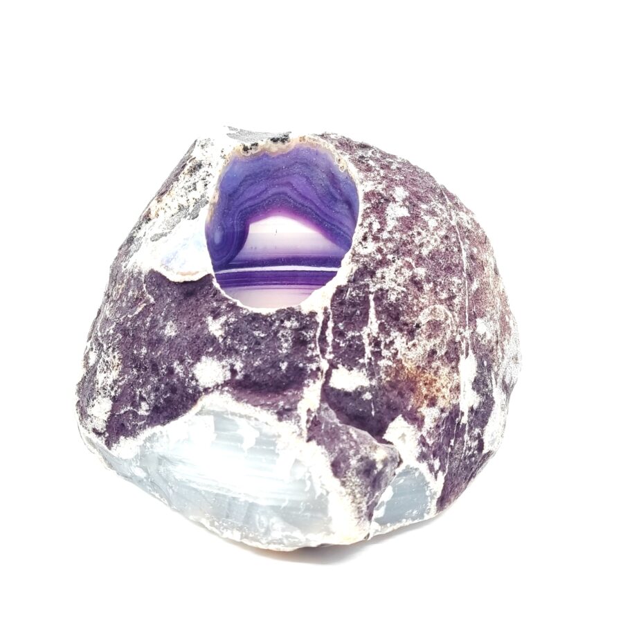 Achátový svietnik fialovej farby s krásnou kresbou a s otvorom na čajovú sviečku. Zaslaný vám bude konkrétny kus zobrazený na fotografii. Ide o neopracovaný kameň vyleštený z prednej strany.