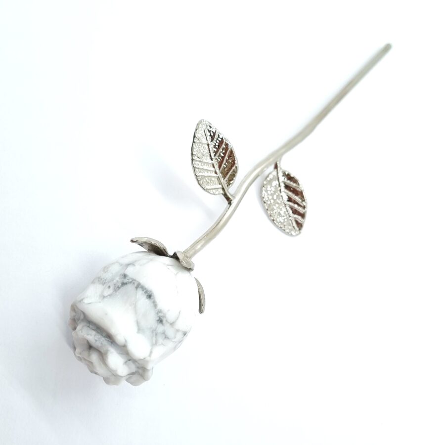 Rozmer: 16 x 5 x 2,5 cm. Stonka ruže je vyrobená z kovu. Každý kus je jedinečný z prírodného minerálu, s jemnými žilami a odtieňmi farieb.