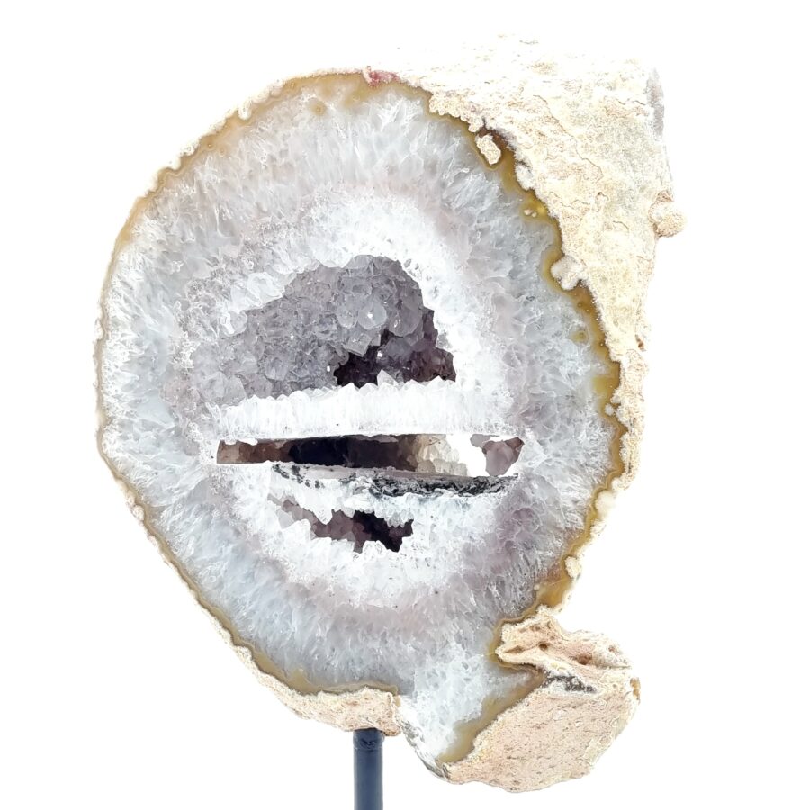Leštený achátový plát na kovovom stojane.