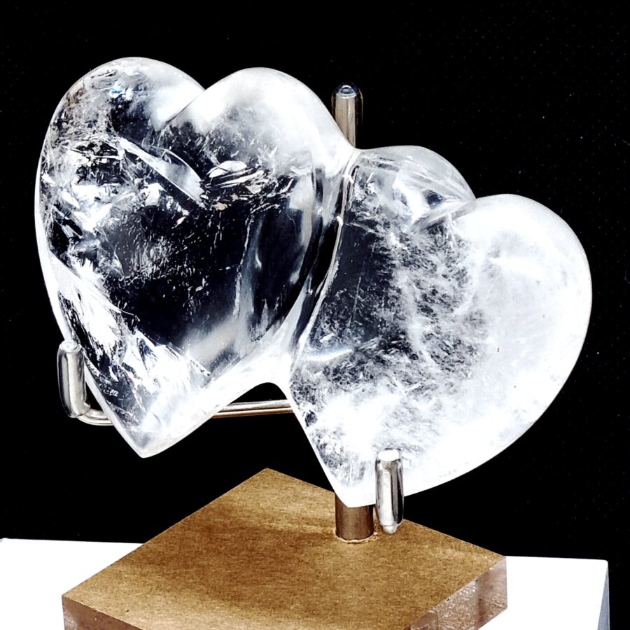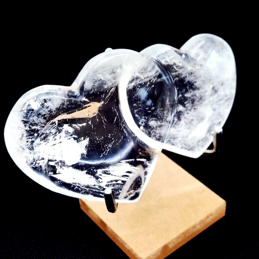 Tieto kryštály boli vyrezané do tvarov srdca a vyleštené do vysokého lesku. Pohybujú sa od chrumkavej čírosti až po mliečnu nepriehľadnosť, prípadne obsahujú chumáče a malé dúhové alebo minerálne inklúzie.