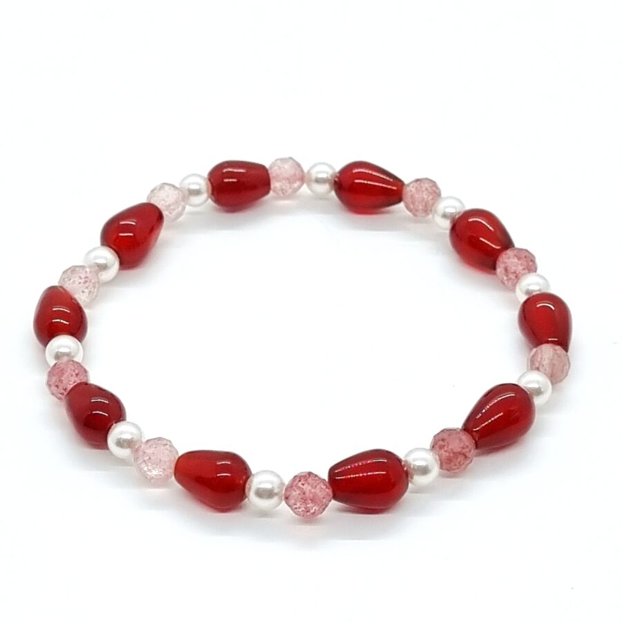 Náramok z Karneolu slzičky o rozmere 6×9 mm + Kremeň jahodový o ∅ 5 mm + Perlička biela o ∅ 4 mm.