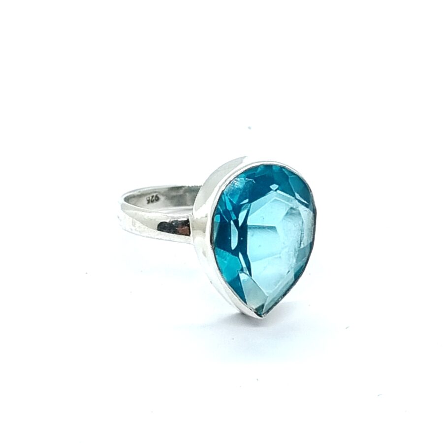 Krásny dámsky strieborný prsteň s modrým topásom. Prsteň je vyrobený zlatníckou technikou zo striebra Ag 925 /1000. Osadený je krásny fazetovaný kúsok Topásu v tvare slzy. Prírodná farba bez úprav.